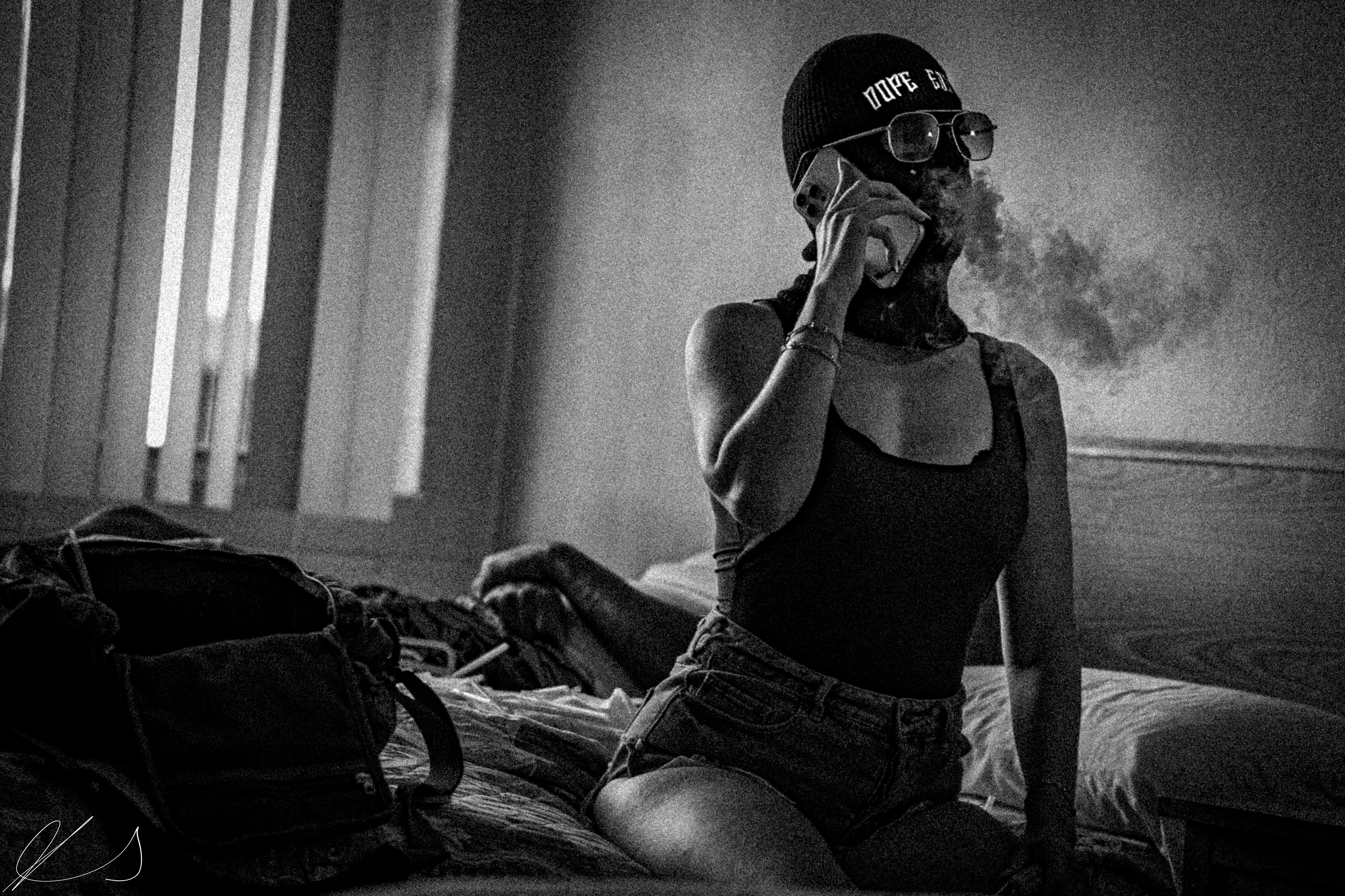 Smoke drifts through the stale motel air. The desert burns, but the room suffocates. Breathless, no mercy.